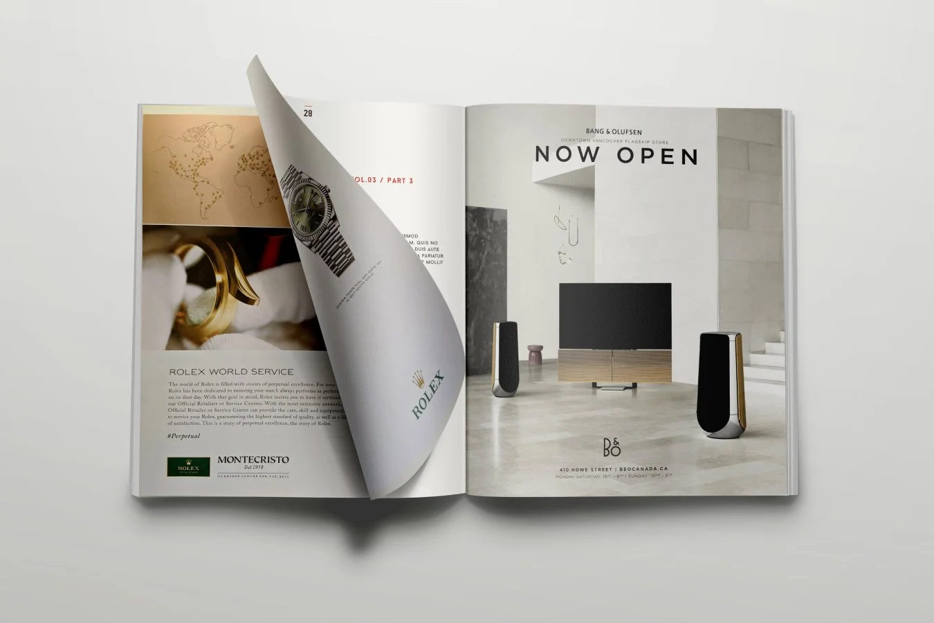 Printed advertisements for Bang & Olufsen Vancouver in Montecristo magazine